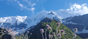 Hapakun to Tagaphari 3300M (2-3 hours, 3km, 450m ascent). A steep trail continues from Hapakun to Tagaphari. The trail eases off and contours the rocky slope for 30 minutes to a verdant bowl where wildflowers and colorful songbirds thrive. Sweeping gently through the meadow, the trail enters scattered juniper stands and climbs switchbacks to the windy ridge top, where Diran, Rakaposhi, and their interconnecting ice wall finally come into full view. The trail thins and traverses a rocky cliff above the spectacularly broken Minapin 15 minutes to Tagaphari (3261m) Taga means muddy and Phari means pool in Burushaski Language. From Tagaphari you can catch the sunset on Diran and overnight in the tent.